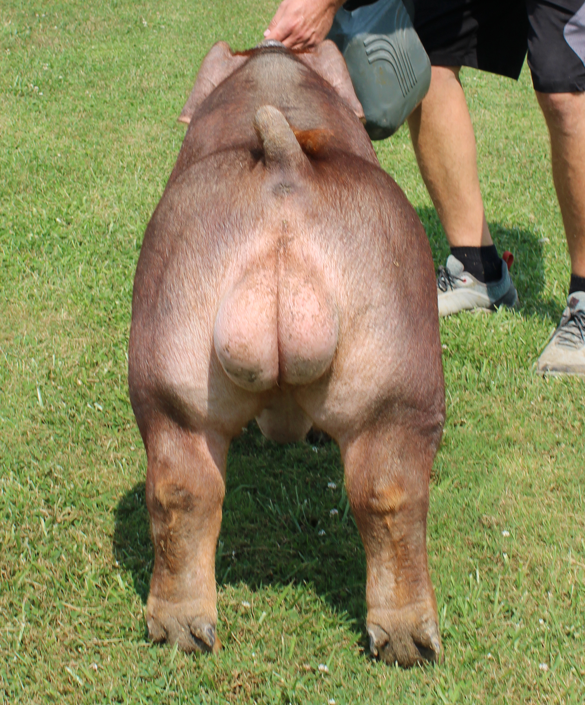 Guys, better study this one. He is intensely line bred on the dam side. Brett Byers's great old Melon N 39-9 is in the pedigree 4 times; TMF1 Melon N 73-1 granddam on the top and bottom of the pedigree. TMF1 Melon N 40-1 is his dam and the granddam of his sire. TMF1 Creation 73-10 is his great grandsire on the top side and his grandsire on the dam side. Anytime you can put that caliber of line bred sows in one pedigree, you are making a huge leap forward in building better hogs that will generate. We consider this guy a genetic giant. Delta Don is out of a great litter with several boars getting great homes. He is a littermate to Lava at Genetic Edge and Drum Roll at Upperhand. Delta Don was our pick. He has absolutely great feet and toes; they are huge and even. We took several pictures because he is so good from different angles. Massive bone, super flexible hip, great flexibility in all of his joints. He is super clean jointed with ideal skeleton. He is tall fronted but with a moderate frame size. He is level topped with a long full rump, lots of rib and counterbody. He has a big square top with a massive skull. This guy will be a big player in building those top barrows and gilts for any size show nationwide. Genetically he will leave you with hogs to build with. Better study your lesson here; he is about as good as it gets at building the next generation of Durocs for the showring and beyond. Don Smith and I have been good friends for close to 50 years and we consider it a privilege to own this genetic giant with him!